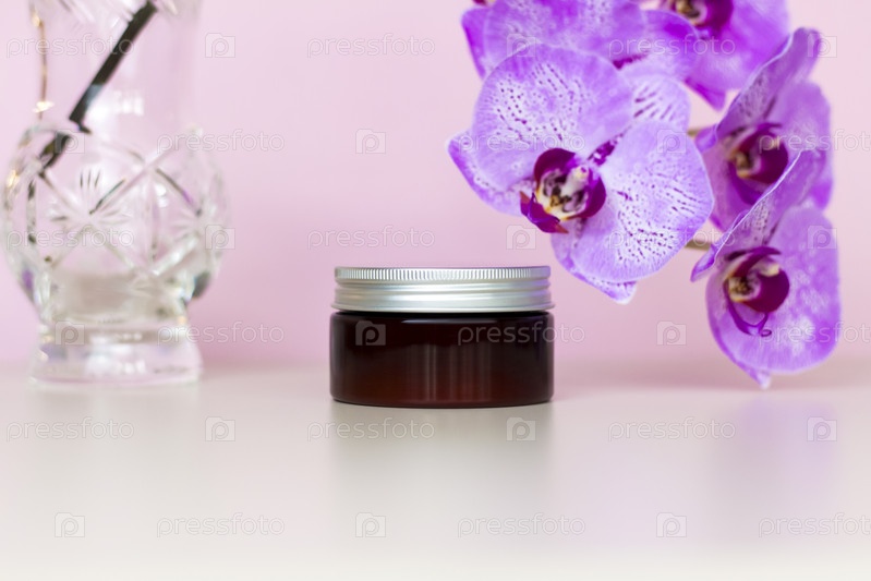 Коричневая банка крема на розовом фоне с красивыми орхидеями. Стильный внешний вид продукта, макет, индивидуальность