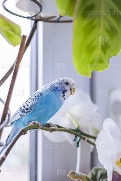 Красивый голубой волнистый попугайчик сидит без клетки на комнатном растении. Тропические птицы дома
