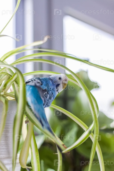 Красивый голубой волнистый попугайчик сидит без клетки на комнатном растении. Тропические птицы дома