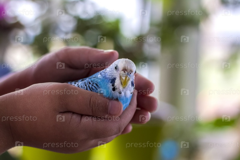 Красивый голубой волнистый попугайчик сидит в руке ребенка. Тропические птицы дома