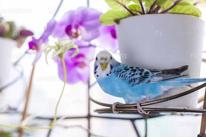 Красивый голубой волнистый попугайчик сидит без клетки на комнатном растении. Тропические птицы дома