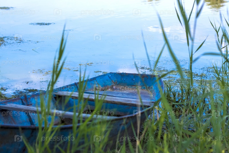 Старая железная лодка у реки. Камыши на реке под солнцем. летний пейзаж с лодками
