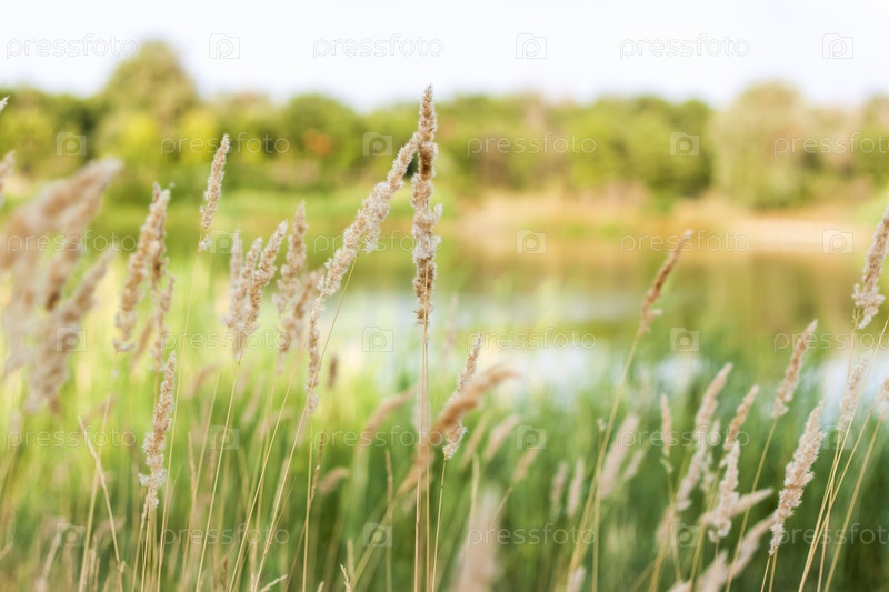 Пампасная трава на озере, тростник, семена тростника. Камыши на озере качаются на ветру на фоне голубого неба и воды