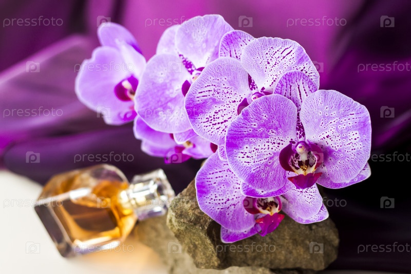 Флакон духов стоит на камне на фоне красивых орхидей. Стильный внешний вид, планировка, индивидуальность. Баннер, место для текста