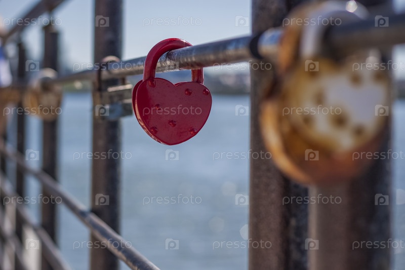 На ограде моста висит дверной замок в форме сердца, символ любви и верности на фоне озера. Замок в форме сердца символизирует верность и любовь