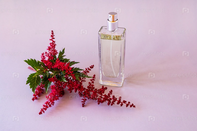 Шикарный флакон женских духов или туалетной воды на розовом фоне с веткой красной астильбы. шаблон для духов