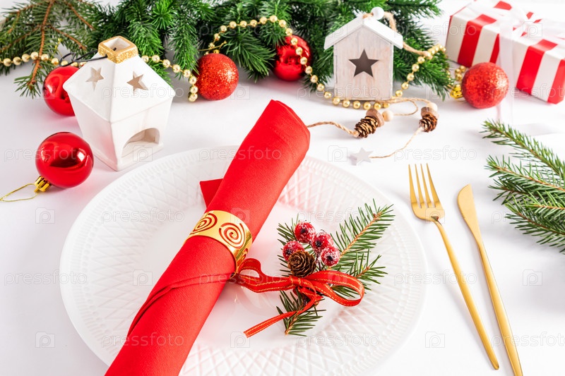 Праздничная сервировка рождественского или новогоднего стола в классическом стиле в красно-белых тонах с зелеными еловыми ветками, елочными украшениями