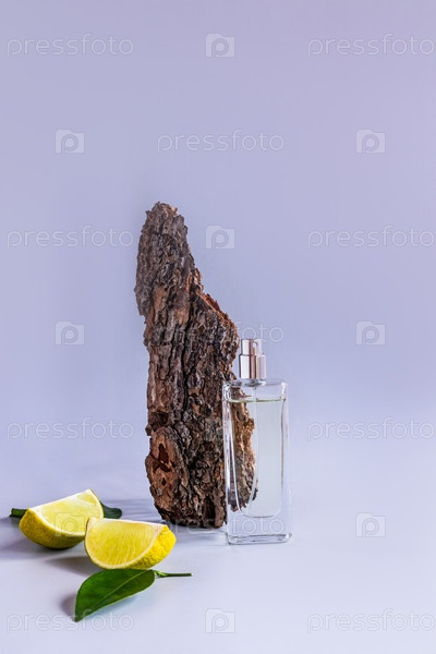 Флакон духов и композиция с натуральным камнем и дольками лимона. презентация аромата женских духов с нотками цитрусовых