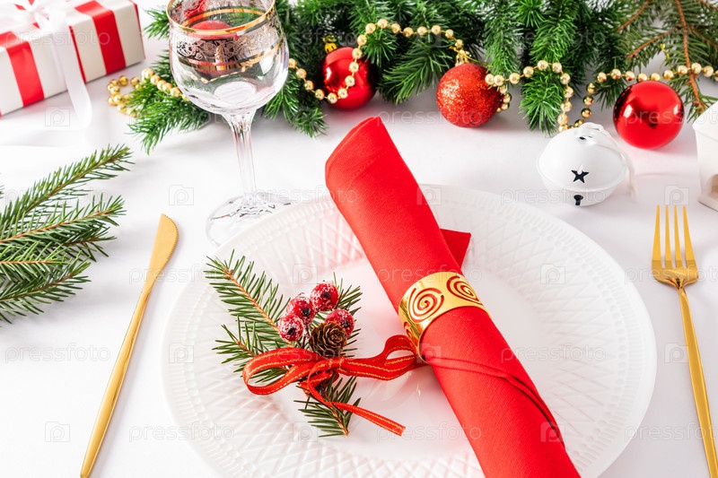 Сервировка рождественского стола с тарелкой, золотыми столовыми приборами, рождественскими украшениями и подарками. передний план