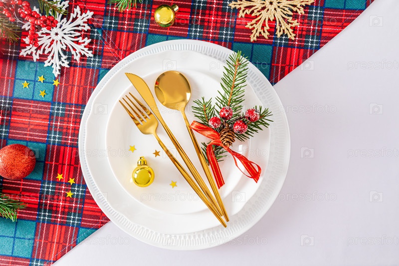 Красивый вид на праздничную сервировку новогоднего или рождественского стола. набор белых тарелок и золотых столовых приборов с украшениями