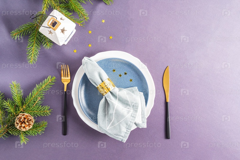 Сервировка праздничного стола к Новому году и Рождеству. тарелки и столовые приборы, тканевая салфетка с украшением. вид сверху. серая скатерть