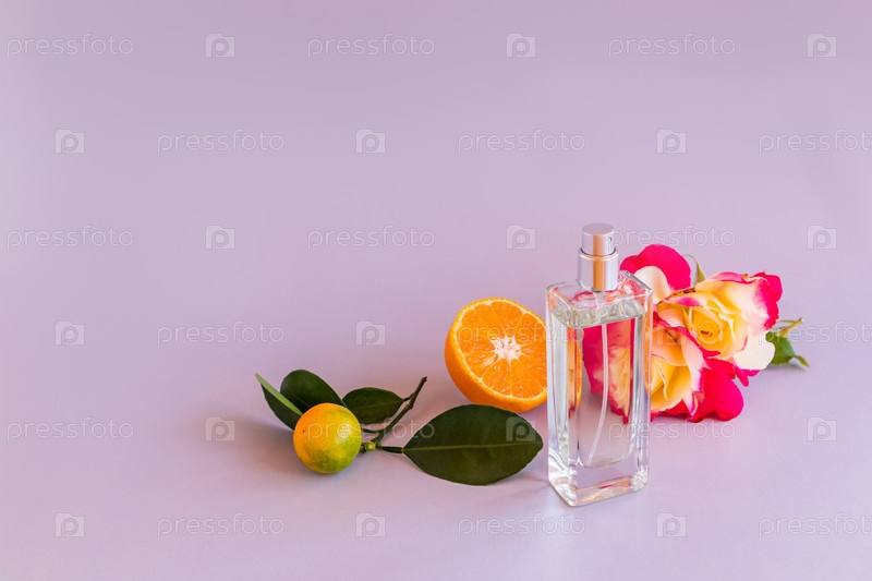 Красивая композиция из флакона духов, цветной розы, ломтиков и фруктов мандарина на пастельном фоне. копия пространства. безымянный флакон