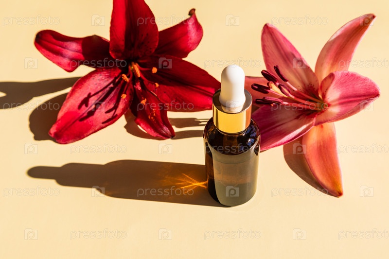 Флакон для лица в стеклянной бутылке с капельницей на бежевом фоне в лучах солнца и цветок лилии. натуральная косметика