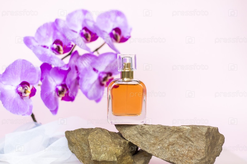 Флакон духов стоит на камне на фоне красивых орхидей. Стильный внешний вид, планировка, индивидуальность. Баннер, место для текста