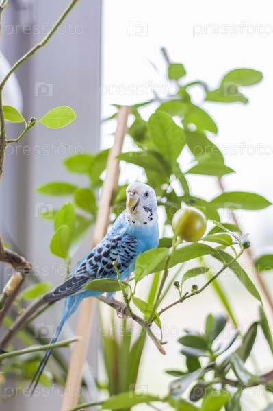 Красивый голубой волнистый попугайчик сидит без клетки на комнатном растении. Тропические птицы дома