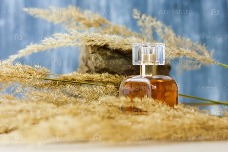 Флакон духов на фоне пампасной травы на цветном фоне и камень. пушистая веточка. Стильный внешний вид, планировка, индивидуальность. Баннер, место для текста