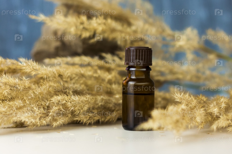 Бутылка косметического масла на фоне пампасной травы на цветном фоне и камень. Стильный внешний вид, планировка, индивидуальность. Баннер, место для текста