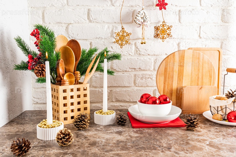 Фрагмент кухонной столешницы, украшенной к новому году и рождеству. уютный интерьер современной кухни. еловые ветки, свечи, шары