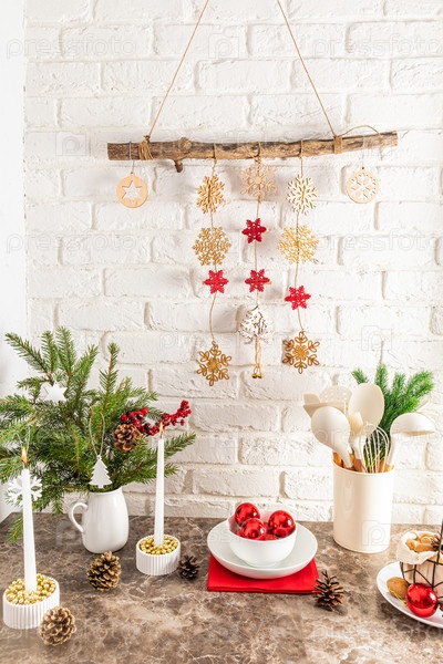 Вертикальный вид современной кухонной столешницы, украшенной к Новому году и Рождеству. самодельная гирлянда на стене из белого кирпича