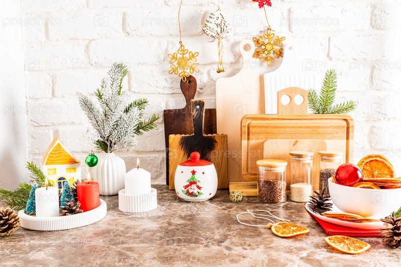 Красивый вид на украшенную кухонную столешницу к Новому году и Рождеству. горящие свечи, ветка в вазе, дольки сушеного апельсина
