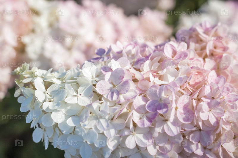 Гортензия в саду на клумбе под открытым небом. Сочное восхитительное огромное соцветие белых и розовых гортензий в саду