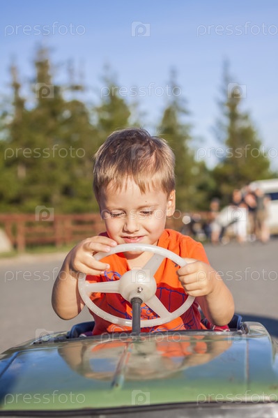Мальчик за рулем детской машины. Радостные эмоции. Дети, портрет