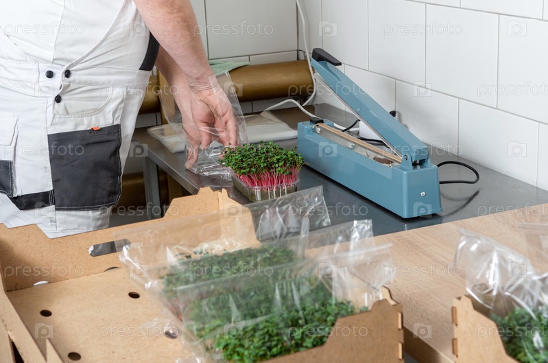 Упаковка урожая микрозеленого горошка для продажи в супермаркете. Выращивание семян в теплице. Микрозеленая ферма. Производство экологически чистого витаминного питания