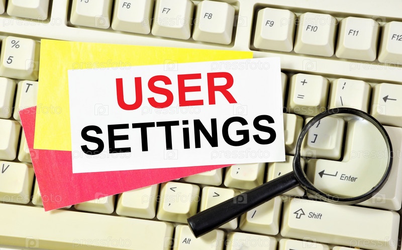 Пользовательские настройки. Надписи на цветных наклейках на фоне компьютерной клавиатуры и увеличительного стекла для исследований