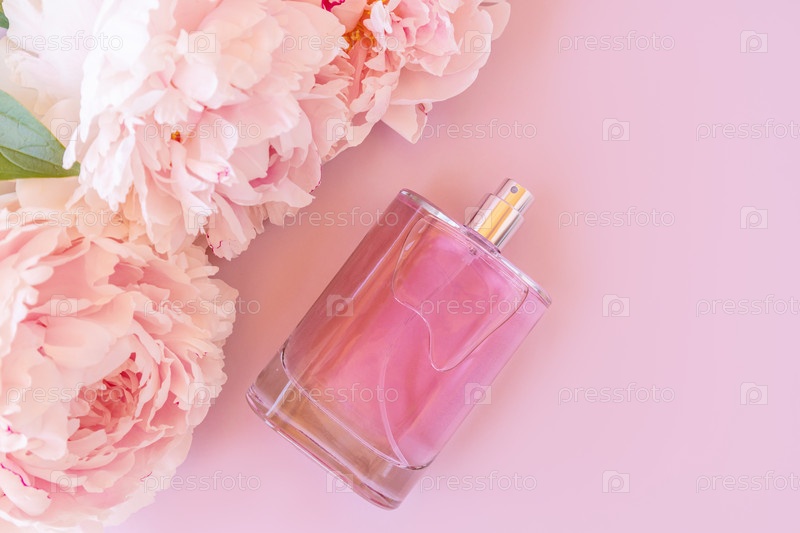 Бутылка элегантных цветочных духов или туалетной воды среди свежих нежных пионов на розовом фоне. презентация аромата. натуральные духи