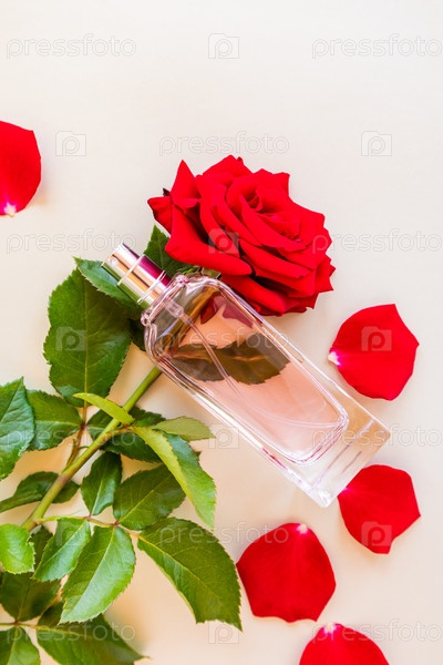 Прозрачная бутылка духов или туалетной воды на бежевом фоне с красной розой и лепестками. вид сверху. презентация аромата
