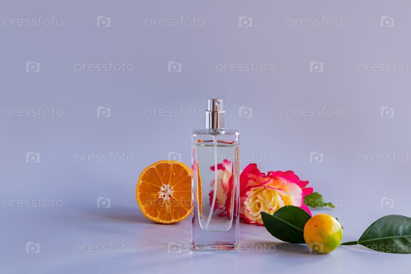 Шикарный флакон женских духов или туалетной воды на фоне цветной розы и дольки цитрусовых. безымянная бутылка для рекламы
