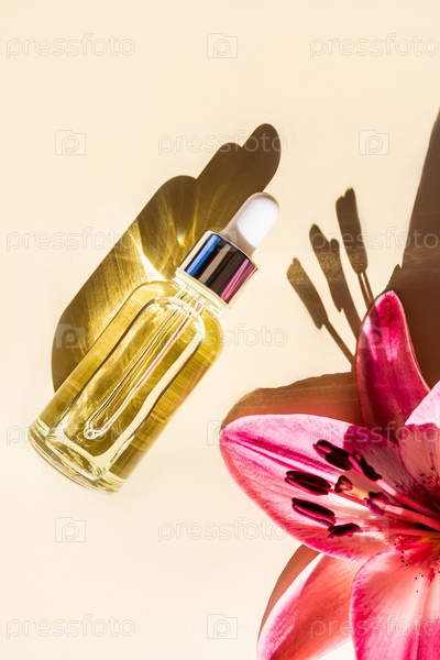 Косметическая бутылка с капельницей на бежевом фоне и цветы в лучах солнца. натуральный продукт по уходу за кожей. вертикальный вид