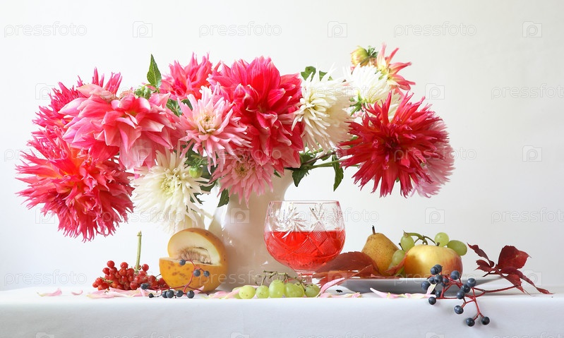 Натюрморт с букетом георгинов на белом фоне с фруктами