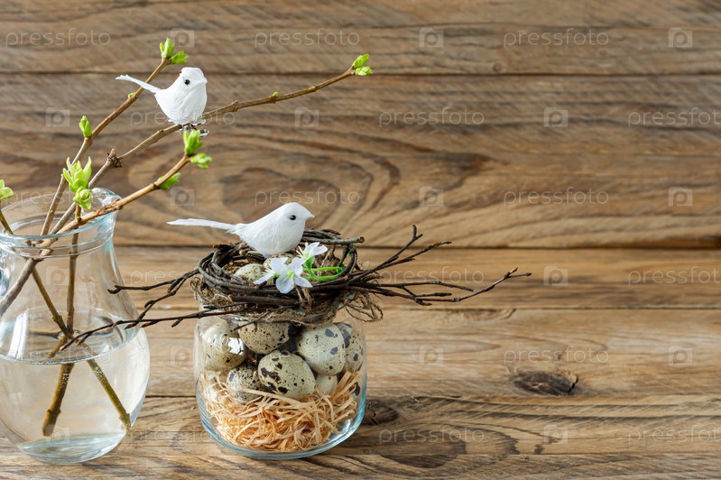 Композиция с гнездом из веток, перепелиными яйцами и мелкими птицами. Пасхальные праздники в деревенском стиле