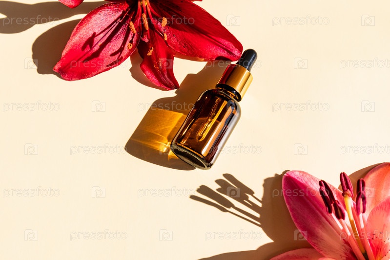 Сыворотка для лица в стеклянной бутылке-капельнице на бежевом фоне с лилиями. масло гиалуроновой кислоты, сыворотка с коллагеном и пептидами