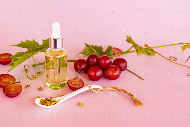 Косметический прозрачный флакон с пипеткой с органическим средством по уходу за кожей лица на основе виноградных косточек. Вид спереди розовый фон