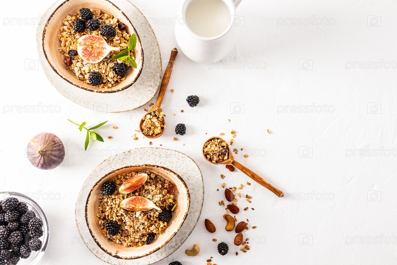 Вид сверху на миску со здоровым здоровым завтраком из мюсли или мюслей и ингредиентов для его приготовления. белый фон. Детокс
