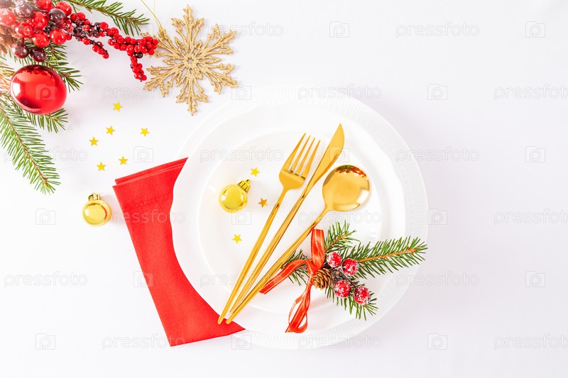 Вид сверху на зимний праздничный стол с сервировкой в классическом стиле празднования Нового года. Рождественские украшения . макет фона