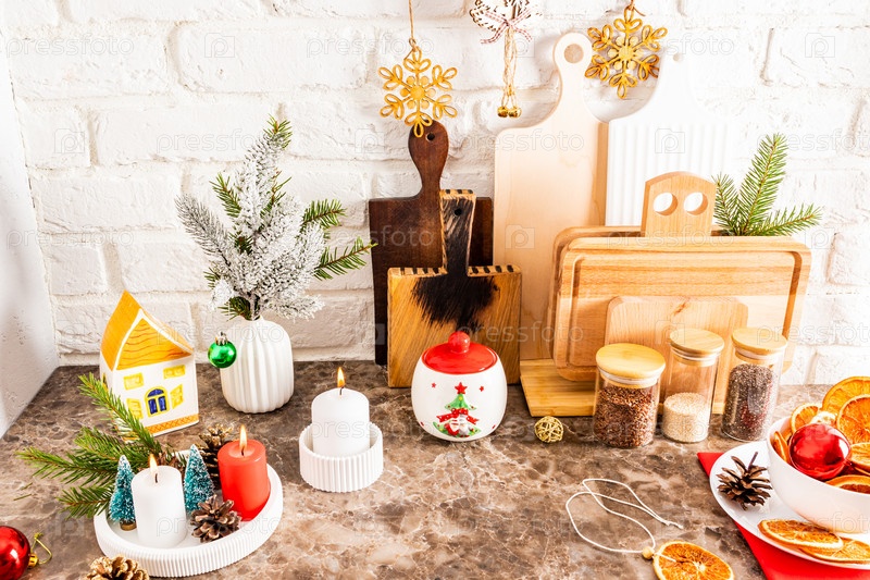Украшенная столешница современной кухни к Новому году и Рождеству. Различная посуда и рождественские украшения. белая кирпичная стена