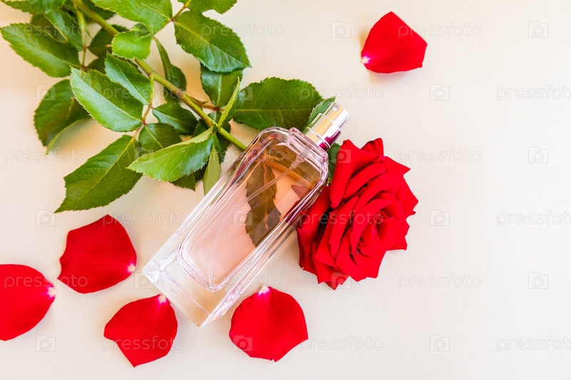 Флакон элегантных духов с нотками аромата розы на бежевом фоне с красным цветком розы и лепестками. духи из натуральной косметики