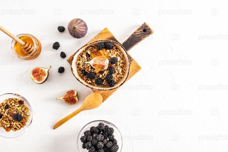 Вкусные полезные мюсли с сухофруктами и медом, свежей ежевикой и инжиром в керамической миске на разделочной доске. вид сверху. белый фон