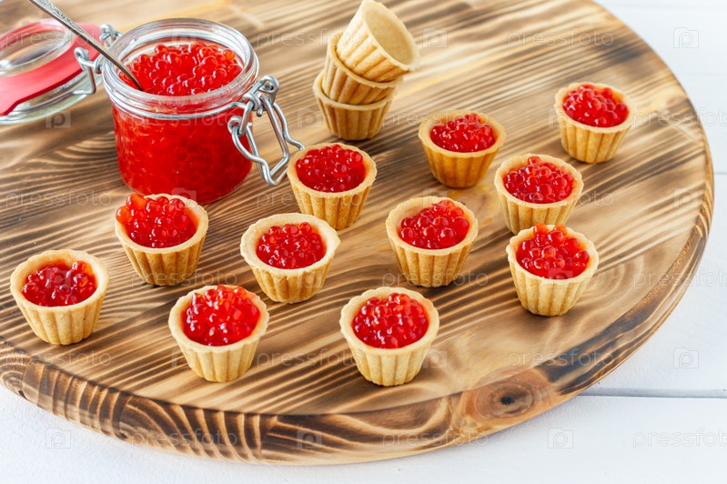 Тарталетки со сливочным маслом и красной икрой. Изысканная еда, закуски. Гастроном. Морепродукты