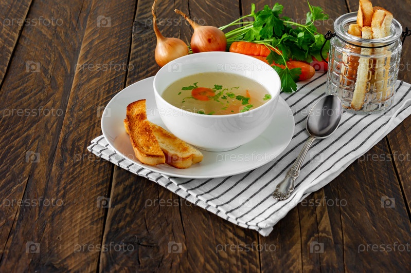 Куриный бульон с петрушкой в белой миске и гренками на деревенском деревянном фоне