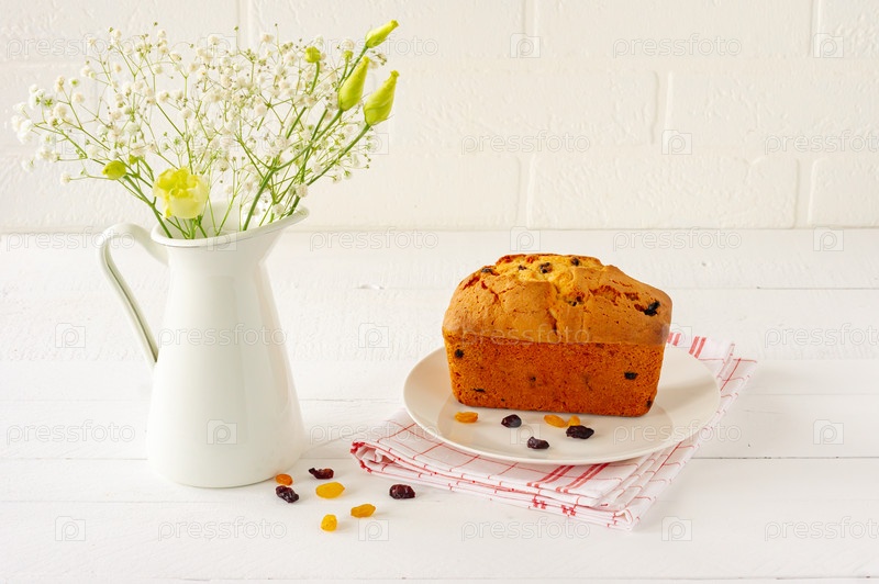 Вкусный домашний кекс из творога и изюма на белом деревенском деревянном фоне