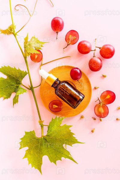 Вертикальный вид косметической бутылки с пипеткой с натуральным средством или сывороткой на основе масла виноградных косточек. глубокое увлажнение. биокосметика