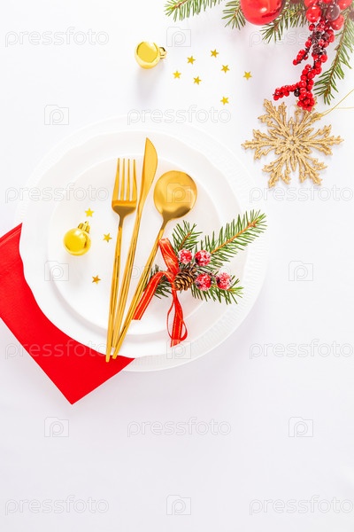 Вертикальный вид набора белых тарелок, золотой вилки, ложки, ножа, красной салфетки на белой скатерти. Рождественские украшения. праздничная подача