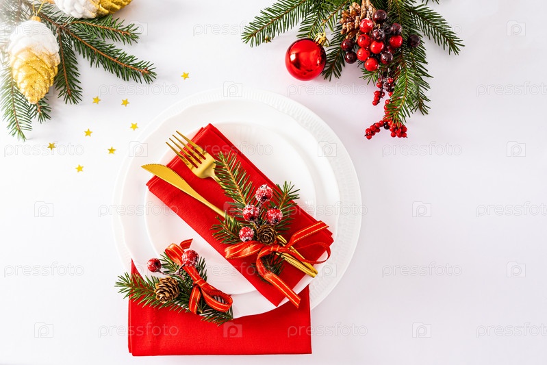 Праздничная сервировка рождественского стола в бело-красных тонах. золотые столовые приборы, украшенные безделушками. вид сверху. белый фон