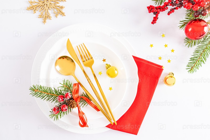 Красивая праздничная сервировка новогоднего стола. белые тарелки, золотой набор столовых приборов, шары, снежинки, еловая ветка. вид сверху