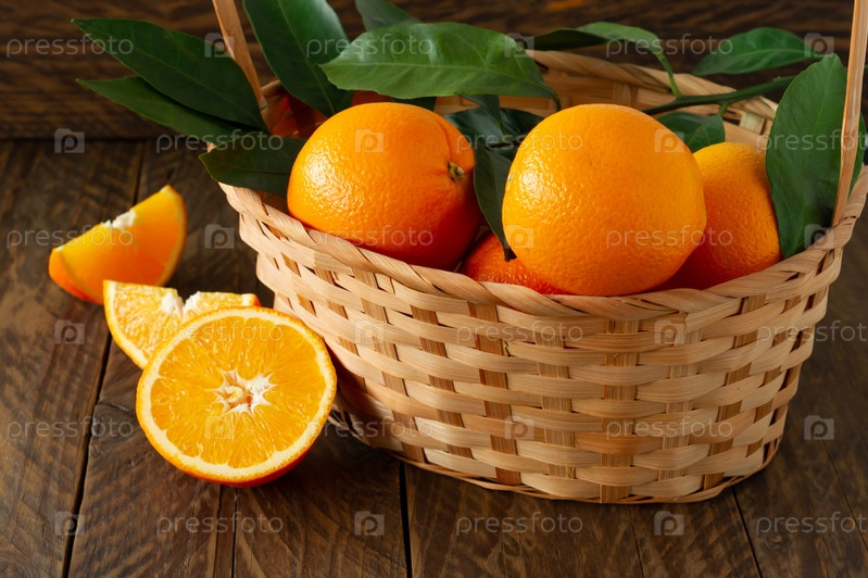 Свежие сочные апельсины с зелеными листьями в корзине на деревянном фоне