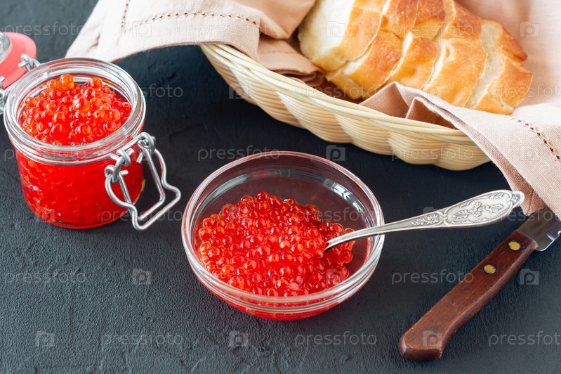Красная икра в стеклянной банке с серебряной ложкой подается с хлебом. Морепродукты. Здоровое питание. Диета. черный фон